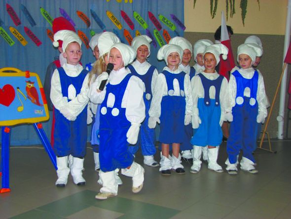Dyrektor szkoły Katarzyna Abramczyk powitała zebranych. Uczniowie klas pierwszych zaprezentowali swoje aktorskie talenty podczas inscenizacji, którą przygotowali pod kierunkiem wychowawców kl. I a i I b – Barbary Dawickiej i Jolanty Deptuły. W przedstawieniu zaprezentowali bajkowy świat smerfów.