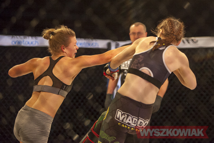 Następnie przyszedł czas na pierwszy tego wieczora, wyszkowski akcent. W oktagonie pojawiła się bowiem zawodniczka Bambero Wyszków Team, Natalia Jędrysiak. Rywalką walczącej w kategorii do 52 kilogramów Natalii była Aleksandra Rola. Pierwsza runda pojedynku upłynęła pod znakiem walki w stójce. Rywalizacja była wyrównana, jednak z wymian częściej zwycięsko wychodziła bardziej doświadczona Rola. W drugiej odsłonie rywalka trenująca na co dzień w Górniku Łęczna zaskoczyła wyszkowiankę obaleniem, po czym zmusiła ją do poddania walki w wyniku duszenia zza pleców.