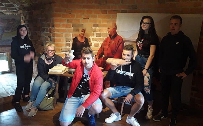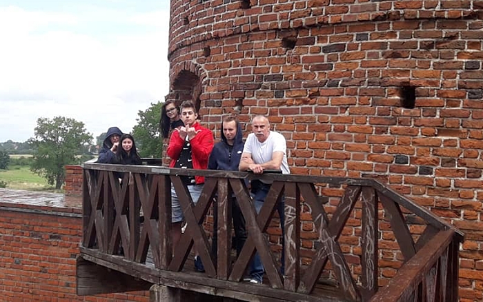 Potem ruszyliśmy na zwiedzanie wież i murów obronnych. Na każdej kondygnacji była wystawa, na ceglanych ścianach wyświetlane fragmenty filmu „Krzyżacy” i prezentacje multimedialne. Wszystko to tworzyło niepowtarzalny klimat historyczny. Gdy blankami przechodziliśmy z baszty do baszty, zmoczył nas krótko padający, lecz gęsty, deszcz, po którym mogliśmy osuszyć się w zamkowym więzieniu.