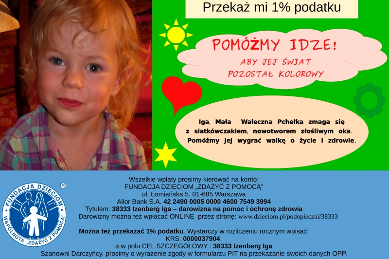 dzieciom.pl trwa zbiórka na rzecz małej Igi. Jej mama, Barbara, tak opisuje chorobę dziecka: „Do ostatniej chwili przed badaniem u okulisty miałam nadzieję, że ten okropny blask w oczku to nic poważnego. I wtedy to się stało, padła diagnoza - siatkówczak. Siedziałam jak sparaliżowana i starałam się skoncentrować na tym, co mówi do mnie lekarz. Tyle strasznych emocji... szok, ból, przerażenie. Ciężko to wszystko opisać słowami. Następnego dnia byłyśmy już na okulistyce w CZD. Parę dni potem rezonans i badanie dna oka. Niestety okazało się, że guz jest bardzo duży. Nacieka na nerw wzrokowy i przednią ścianę gałki ocznej. Jest duże prawdopodobieństwo, ze trzeba będzie usunąć oczko. Przeniesienie na onkologię. Kolejne badania, żeby sprawdzić, czy guz nie dał przerzutów do szpiku i kości. Tu na szczęście czysto. Kolejny dzień, założenie dojścia centralnego i po południu pierwsza chemia. Obecnie Iga jest po dwóch cyklach chemioterapii ogólnej. Na szczęście dobrze zniosła obydwa cykle. Oby tak dalej. Przyszłość jest niepewna, ale walczymy o życie i zdrowie dla Iguśki - mojego Małego Serduszka!”.