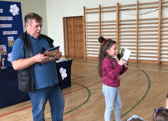 w imieniu wszystkich obecnych dzieci podziękowali za wspaniałe spotkanie, wręczając gościowi kwiatek z podziękowaniem oraz swoje prace inspirowane utworami pisarza. Następnie autor rozdawał autografy w zakupionych przez dzieci i nauczycieli książeczkach, rymując przy tym do każdego podanego imienia krótki wierszyk. W. Drabik ma do tego ogromny talent i wspaniały kontakt z uczniami. To gawędziarz sypiący rymami i anegdotami jak z rękawa. Dodam, że zainteresowanie zakupem książeczek było bardzo duże. Czytelników, którzy będą chcieli wypożyczyć książki Pana Wiesława zapraszam do szkolnej biblioteki.