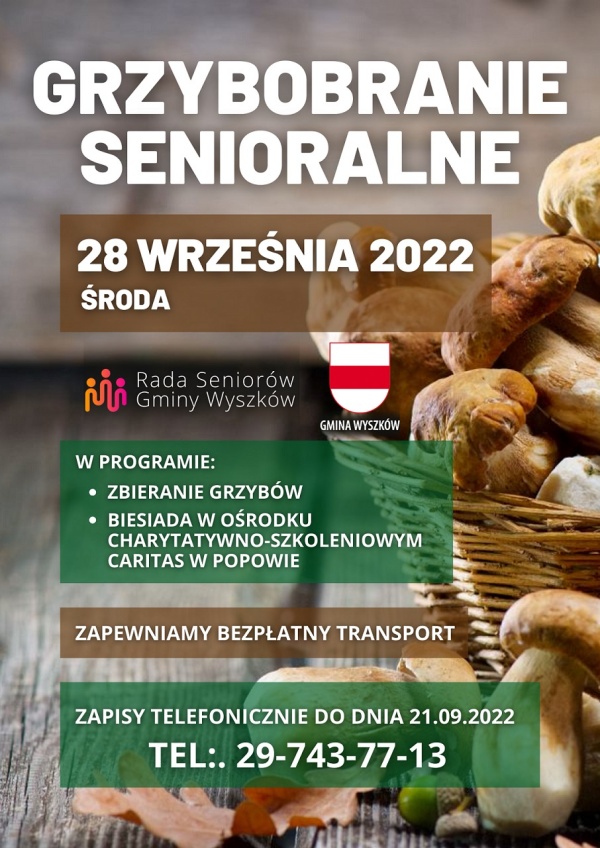 (Zam: 06.09.2022 r., godz. 14.17)Urząd Miejski i Rada Seniorów Gminy Wyszków zapraszają na Grzybobranie Senioralne, które odbędzie się w Popowie 28 września Zapisy pod numerem tel. 29 743 77 13. Bezpłatny transport.