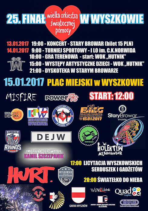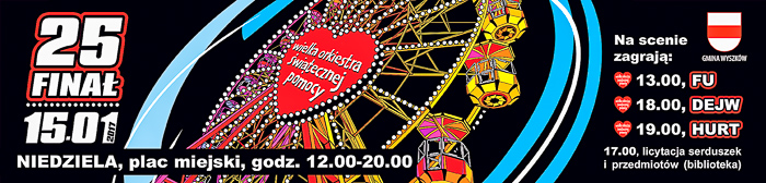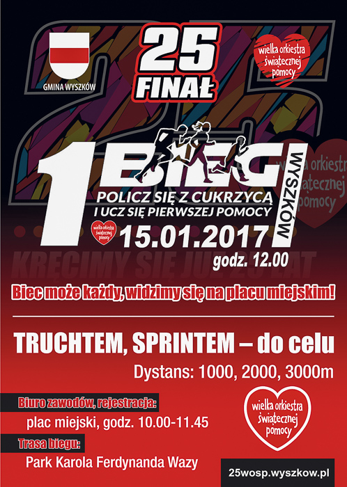 15 stycznia od rana na ulicach miasta będzie można spotkać wolontariuszy (zarejestrowała się ponad setka) z puszkami i serduszkami. O godz. 12.00 ruszy scena plenerowa na placu między ul. Sowińskiego i 11 Listopada. Imprezę poprowadzi Kamil Szcześnik. Wystąpią m.in. zespół z Wyszkowa Misfire, Nadbużanie, Dejw, Hurt, Fu. Szanty zaśpiewają członkowie Klubu Żeglarskiego „Spinaker” – Karolina Eychler i Andrzej Bonalski. Rozgrzewki poprowadzą Joanna Zglec (klub PowerFit Wyszków) oraz drużyna futbolu amerykańskiego Rhinos Wyszków. Pokaz walki zaprezentuje Gimnazjon Apin Wyszków. Harcerze poprowadzą naukę udzielania pierwszej pomocy oraz pokażą symulacje na fantomach. W trakcie całodniowego wydarzenia na placu miejskim rozpalonych zostanie 6 koksowników (przygotuje je Przedsiębiorstwo Wodociągów i Kanalizacji) oraz duże ognisko, przy którym będzie można piec kiełbaski. Organizatorów wspomogą strażacy-ochotnicy z Gulczewa, Kamieńczyka, Lucynowa, Rybna. O godz. 12.30, po wcześniejszej rozgrzewce, wystartuje I bieg charytatywny „Policz się z cukrzycą”, z którego dochód (wpisowe min. 30 zł) zostanie w całości przekazany na zakup pomp insulinowych dla kobiet w ciąży. Trasa przebiegać będzie przez Park Karola Ferdynanda Wazy na dystansach (do wyboru): 1, 2, 3 km. Każdy uczestnik na mecie otrzyma pamiątkowy medal. Szczegóły i regulamin na 25wosp.wyszkow.pl.