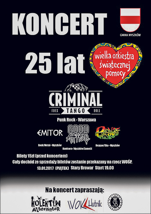 13 stycznia (piątek) zaproszenie o godz. 19.00 do Starego Browaru, gdzie odbędzie się koncert organizowany przez Kolektyw Alternator, Wyszkowski Ośrodek Kultury „Hutnik” oraz Stary Browar. Na scenie tego wieczoru wystąpią: Criminal Tango (punk rock – Warszawa), Don’tWorry (reggae/ska – Wyszków), Good Attitude (hardcore – Wyszków/Zamość), Emitor (rock/metal – Wyszków). Bilety do nabycia w cenie 15 zł (można dać więcej), a cały dochód ze sprzedaży zostanie przekazany na rzecz WOŚP.