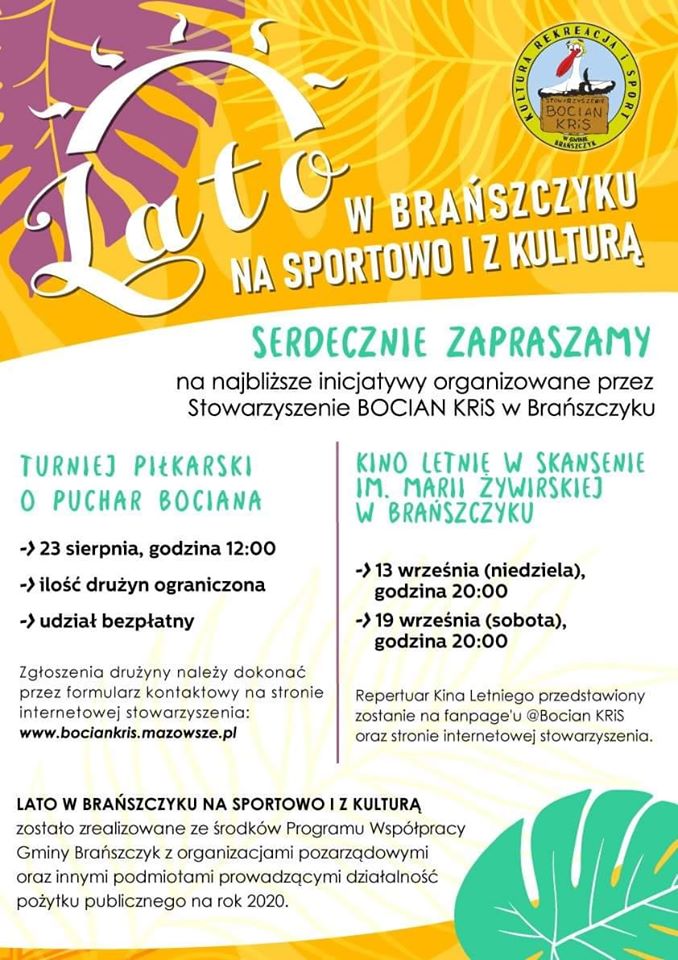 W ramach projektu „Lato w Brańszczyku na sportowo i z kulturą” 13 września i 19 września o godz. 20.00 Stowarzyszenie Bocian KRiS organizuje też projekcie filmowe w skansenie w Brańszczyku. Repertuar ma zaprezentować wkrótce na swojej stronie internetowej i na Facebooku.