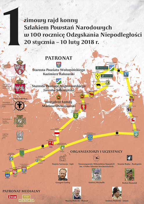 (Zam: 03.02.2018 r., godz. 12.43)W trakcie 700 km marszu w warunkach zimowych chcą odwiedzić miejsca związane z konfederacją barską, insurekcją kościuszkowską, Powstaniem Listopadowym, a w szczególności Powstaniem Styczniowym. Organizatorem przedsięwzięcia są Stowarzyszenie Miłośników Kawalerii im. 1 Pułku Ułanów Krechowieckich z Kobyłki, Stajnia Sarmacja – Łąki i Stajnia Bajka – Radzymin.