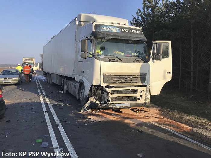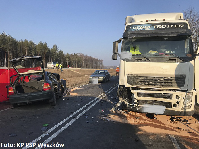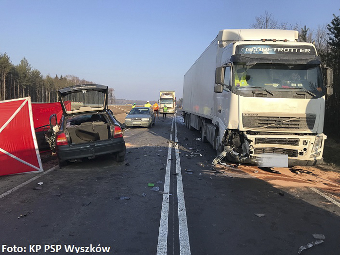 (Zam: 09.02.2018 r., godz. 09.46)Jak wynika z pierwszych ustaleń policjantów pracujących na miejscu zdarzenia, 68-letni kierowca opla astry, mieszkaniec gminy Długosiodło, jadący od Trzcianki w kierunku Knurowca zjechał na przeciwny pas ruchu, gdzie zderzył się z ciężarowym volvo. Niestety, w wyniku poniesionych obrażeń kierowca osobówki poniósł śmierć na miejscu.
