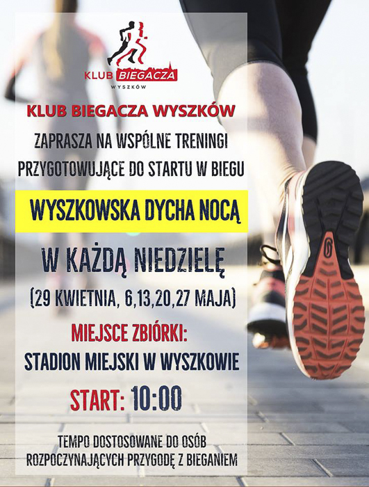 (Zam: 19.04.2018 r., godz. 15.45)Treningi odbywać się będą w niedziele 29 kwietnia, 6, 13, 20, 27 maja. Zbiórka na stadionie miejskim, początek o godz. 10.00. Tempo ma być dostosowane do możliwości osób rozpoczynających przygodę z bieganiem.