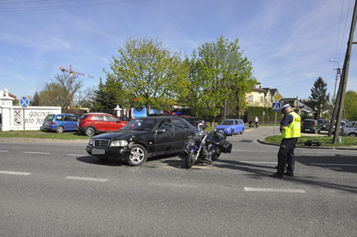 (Zam: 23.04.2018 r., godz. 12.21)22 kwietnia około godz. 15.30 na ul. Białostockiej w Wyszkowie doszło do wypadku drogowego z udziałem motocyklisty i auta osobowego. Jak wynika z pierwszych ustaleń policjantów, kierowca mercedesa nie ustąpił pierwszeństwa przejazdu motocykliście, przez co doszło do zderzenia. Kierujący yamahą z obrażeniami ciała został przetransportowany do szpitala.