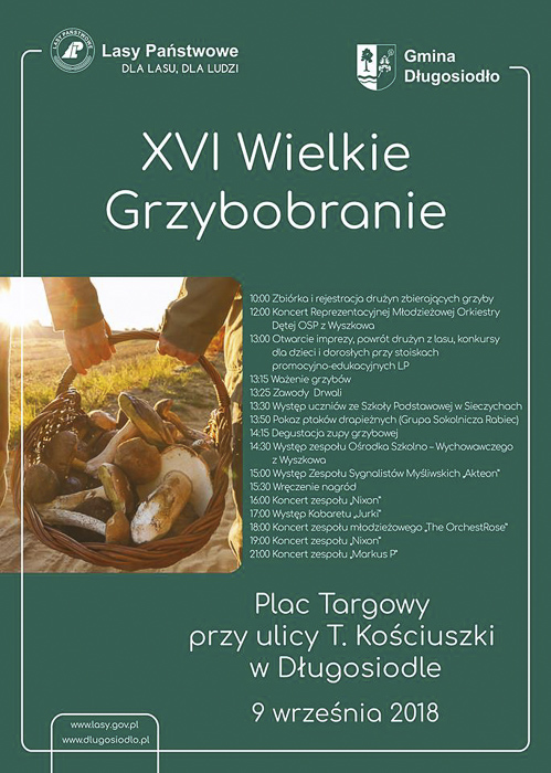 W południe na placu targowym odbędzie się koncert Młodzieżowej Orkiestry Dętej z Wyszkowa. Na godz. 13.00 zaplanowano otwarcie imprezy, powrót drużyn z lasu, konkursy dla dziecii dorosłych przy stoiskach promocyjno-edukacyjnych Lasów Państwowych. O godz. 13.15 rozpocznie się ważenie grzybów. Zawody drwali przewidziano o godz. 13.25, a o godz.13.30 występ uczniów ze Szkoły Podstawowej w Sieczychach. Dalsze punkty imprezy to: godz. 13.50 - pokaz ptaków drapieżnych (Grupa Sokolnicza Rabiec), godz. 14.15 - degustacja zupy grzybowej, godz. 14.30 - występ Zespołu Ośrodka Szkolno-Wychowawczego z Wyszkowa, godz. 15.00 - występ Zespołu Sygnalistów Myśliwskich „Akteon”, godz. 15.30 - wręczenie nagród, godz. 16.00 - koncert zespołu Nixon, godz. 17.00 - występ kabaretu Jurki, godz. 18.00 - koncert zespołu młodzieżowego The OrchestRose, godz. 19.00 - koncert zespołu Nixon, godz. 21.00 - koncert zespołu Markus P.