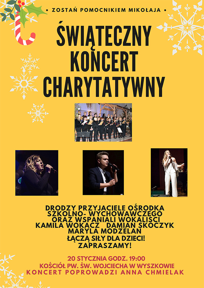 (Zam: 04.01.2019 r., godz. 08.54)Koncert jest organizowany na rzecz dzieci ze Specjalnego Ośrodka Szkolno-Wychowawczego w Wyszkowie. „Świąteczny koncert charytatywny” to wydarzenie, które ma wspomóc walkę z wykluczeniem społecznym podopiecznych placówki. Pieniądze, które zostaną zebrane w trakcie koncertu, będą przeznaczone na terapię dzieci z autyzmem i niepełnosprawnością intelektualną.