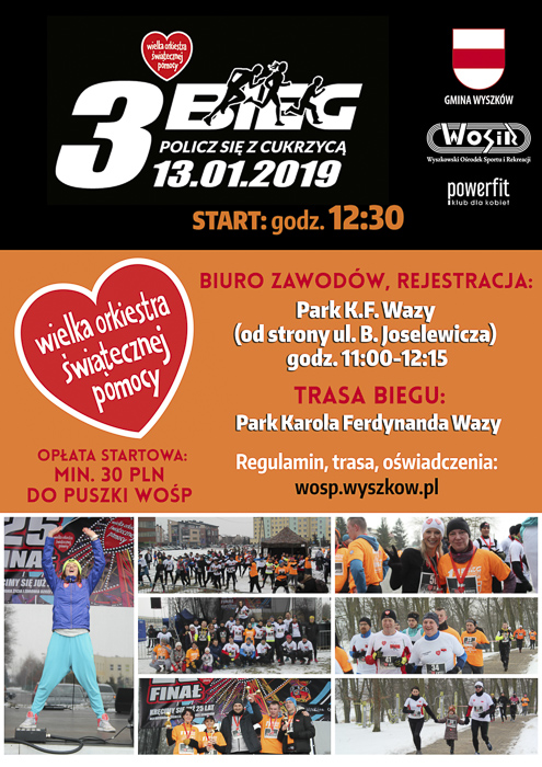 - Bieg „Policz się z cukrzycą” - początek o godz. 12.30 w Parku Karola Ferdynanda Wazy. Wpisowe (dochód przeznaczony na WOŚP) - 30 zł . Dla zawodników pamiątkowe koszulki i medale. Bieg realizuje Wyszkowski Ośrodek Sportu i Rekreacji.