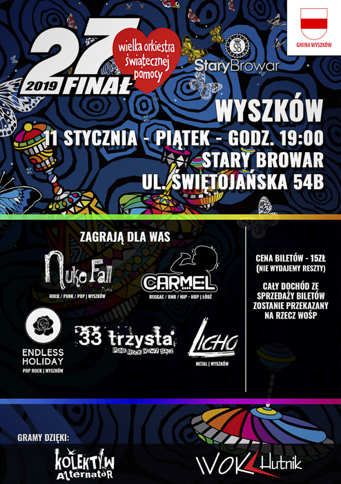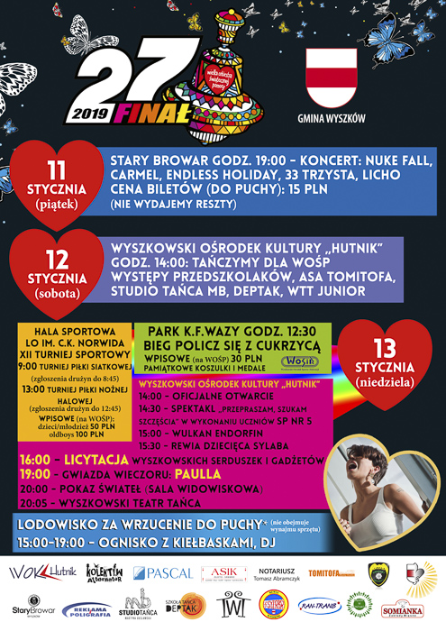 - Wielki Finał w Wyszkowskim Ośrodku Kultury „Hutnik” - godz. 14.00 - oficjalne otwarcie, godz. 14.30 - spektakl „Przepraszam, szukam szczęścia” w wykonaniu uczniów Szkoły Podstawowej nr 5 w Wyszkowie, godz. 15.00 - Wulkan Endorfin, godz. 15.30 - Rewia Dziecięca „Sylaba”, godz. 16.00 - licytacja wyszkowskich serduszek i gadżetów, godz. 19.00 - gwiazda wieczoru Paulla, godz. 20.00 - pokaz świateł (sala widowiskowa), godz. 20.05 - Wyszkowski Teatr Tańca.