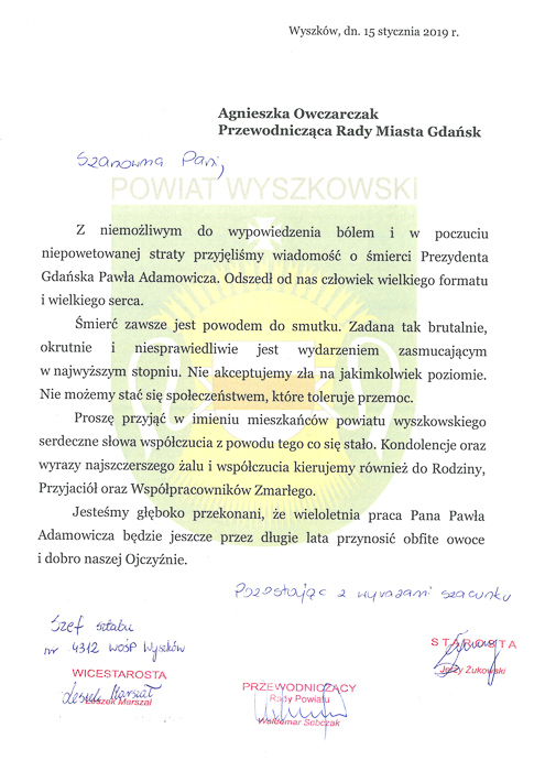 Nikt ich nie krytykuje, że się podpisali pod pismem z kondolencjami po śmierci prezydenta Gdańska ale o formę i treść tego listu chodzi, który ośmiesza naszą społeczność Wyszkowa. Kiedyś podobnie wyglądała moja praca dyplomowa pisana na maszynie przez znajomą, która uczyła się na niej pisać. Później uzupełniałem błędy ortograficzne, tabelki i wyszła pstrokacizna podobna jak w przypadku tego pisma, ale teraz są komputery, drukarki itp. Czy czas stanął w miejscu w starostwie.