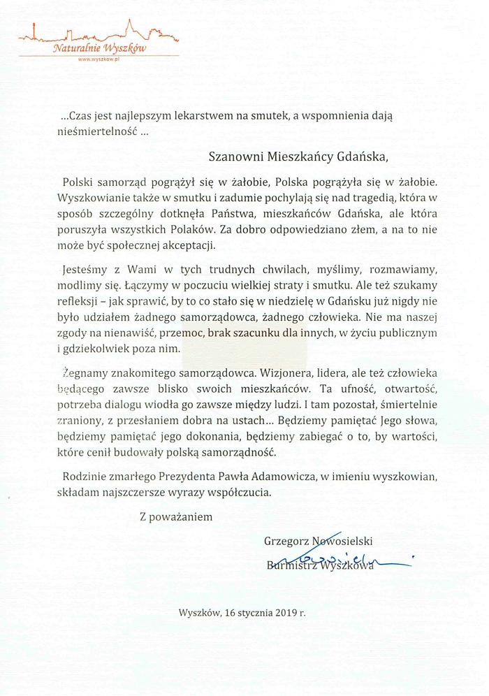 (Zam: 16.01.2019 r., godz. 13.54)„Szanowni Mieszkańcy Gdańska, polski samorząd pogrążył się w żałobie, Polska pogrążyła się w żałobie. Wyszkowianie także w smutku i zadumie pochylają się nad tragedią, która w sposób szczególny dotknęła Państwa, mieszkańców Gdańska, ale która poruszyła wszystkich Polaków. Za dobro odpowiedziano złem, a na to nie może być społecznej akceptacji.