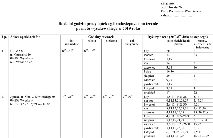 Harmonogram dyżurów aptek określony na 2019 r. to długa i dość skomplikowana tabela. W każdym bieżącym wydaniu „Wyszkowiaka” będziemy podawać dyżury aptek na konkretny tydzień.