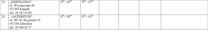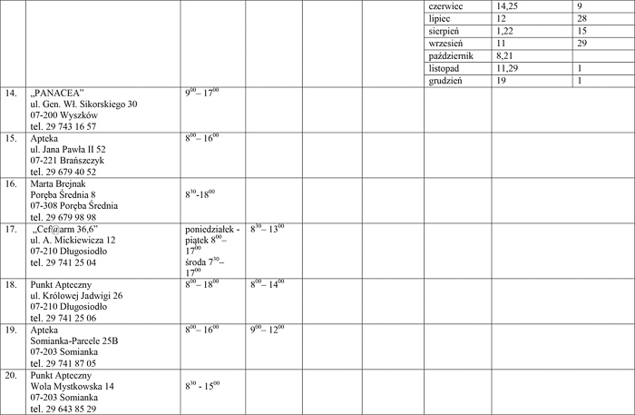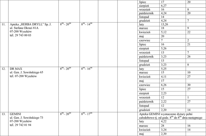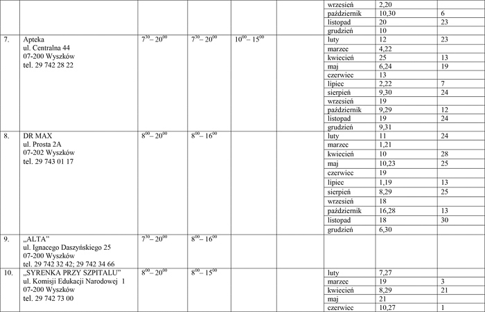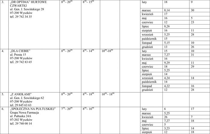 - Pozostali obecni ustalili, że zgadzają się na dyżury aptek rotacyjne w godzinach nocnych pod warunkiem, że wszystkie apteki mające swoją siedzibę w Wyszkowie wyrażą wolę objęcia nocnych dyżurów. Z uwagi na brak możliwości wypracowania kompromisu dyżury aptek ogólnodostępnych dla powiatu wyszkowskiego rozdzielone zostały proporcjonalnie pomiędzy czternaście aptek mających swoją siedzibę na terenie Wyszkowa - podkreśliła naczelnik.