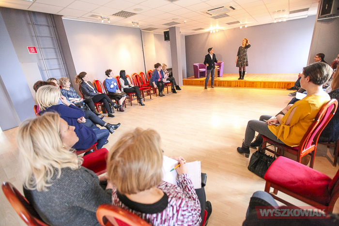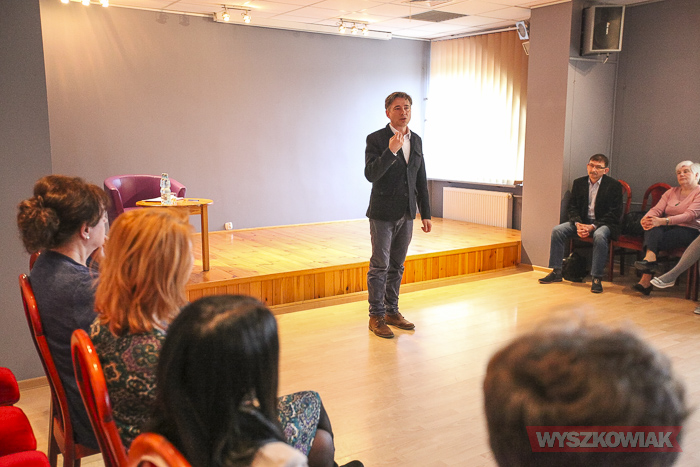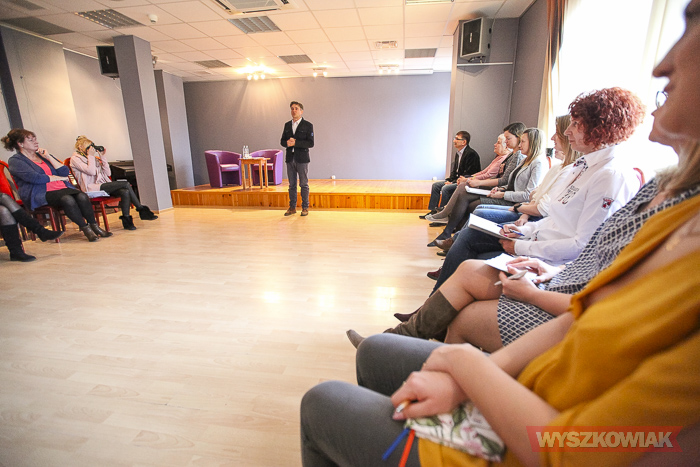 Wspólnie z uczestnikami szkolenia wskazał główne problemy, które napotykają osoby recytujące wiersze, czyli tremę, tempo mówienia, dobór repertuaru itp.