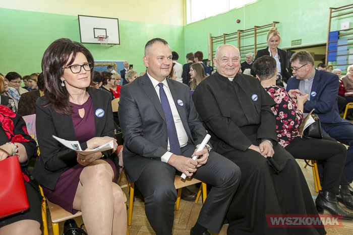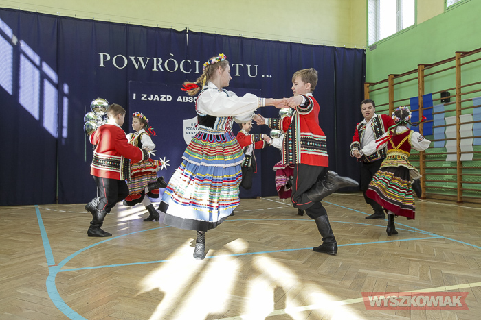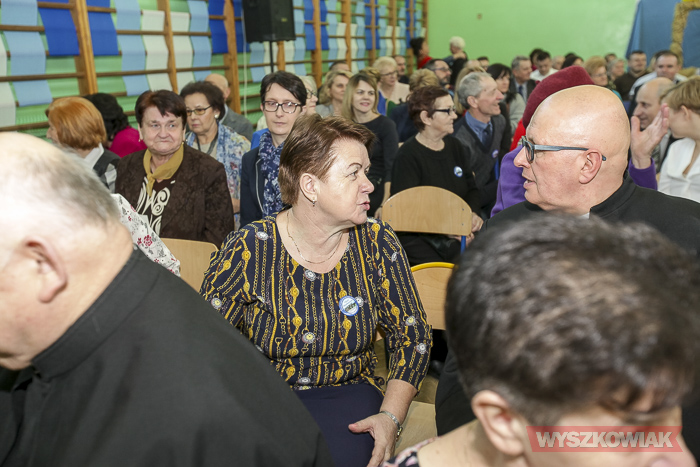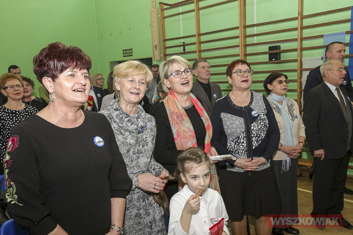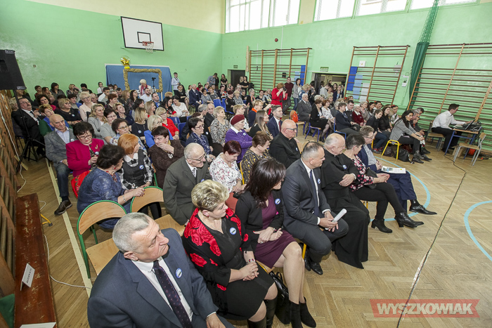 (Zam: 25.02.2019 r., godz. 13.44)Uroczystość odbyła się 23 lutego i rozpoczęła się od mszy. Część oficjalną przygotowaną w sali gimnastycznej Szkoły Podstawowej im. Jana Pawła II w Leszczydole-Nowinach poprowadzili absolwentka Anna Mróz i uczeń trzeciej klasy gimnazjum Wiktor Mikołajczyk. Spotkanie zainaugurował polonez, którego zatańczyli dyrektor szkoły Krzysztof Ochmański, absolwenci oraz członkowie działającego w placówce Zespołu Pieśni i Tańca „Wyszków”.