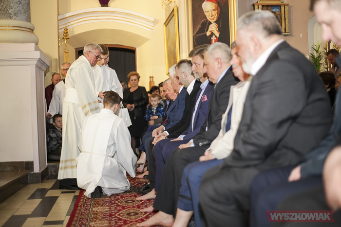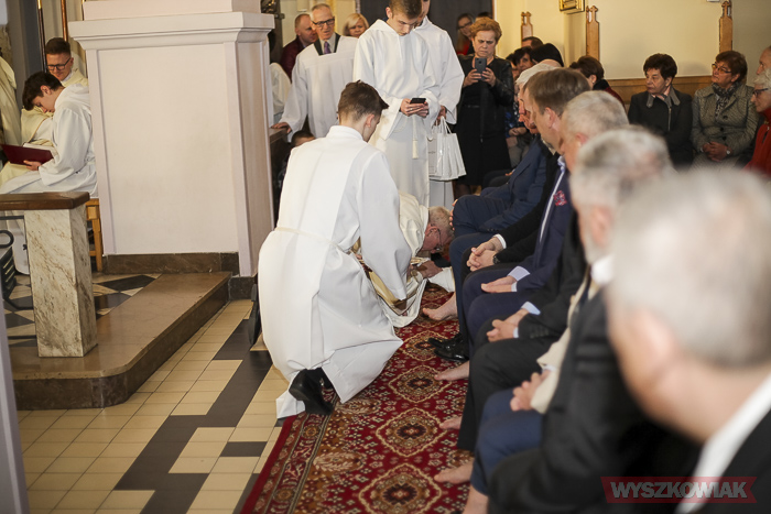 - W tym roku do tego nakazanego przez Jezusa obrzędu umywania nóg zaprosiłem radnych samorządu miejskiego i powiatowego, bo to rok szczególny - przypada stulecie odzyskania praw miejskich przez Wyszków, który od swojego zarania jest zamieszkały przez chrześcijan. Ten moment jest dla nas też i wezwaniem, abyśmy wypełniając nasze życiowe powołanie, tak jak uczy Jezus, nie panowali nad innymi, ale pełnili pokorną służbę dla drugiego człowieka. Dziękuję radnym, że zechcieli przyjąć moje zaproszenie dla uczczenia w duchu wiary rocznicy stulecia odzyskania praw miejskich - stwierdził proboszcz. - Dziś też dzień kapłański, gdy dziękujemy Bogu za kapłaństwo Chrystusowe, które jest naszym udziałem. Jako proboszcz pragnę podziękować wszystkim księżom, moim najbliższym współpracownikom za posługę sakramentalną w naszym Sanktuarium. Dziękuję za posługę modlitwy przez codzienne sprawowanie Eucharystii i posługę głoszenia Słowa Bożego. Dziękuję za gorliwą posługę konfesjonalną i odwiedzania chorych z Sakramentem Namaszczania, za trud katechizacji i za każdą życzliwą radę i dobre pomysły. Dziękuję za trud duszpasterskiej opieki nad dziećmi, młodzieżą, starszymi w różnych grupach religijnych.