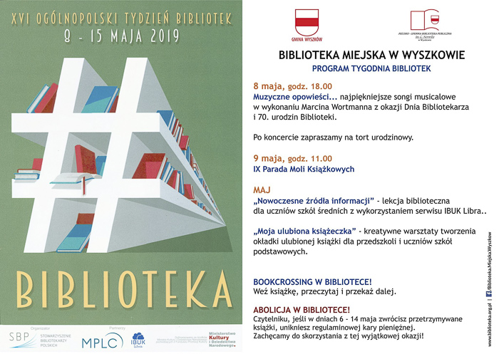 (Zam: 06.05.2019 r., godz. 13.13)Po raz szesnasty Stowarzyszenie Bibliotekarzy Polskich organizuje (8-15 maja) Ogólnopolski Tydzień Bibliotek - program promocji czytelnictwa i bibliotek. Ma on na celu podkreślanie roli czytania i bibliotek w poprawie jakości życia, edukacji oraz zwiększanie prestiżu zawodu bibliotekarza i zainteresowania książką. Hasłem Tygodnia Bibliotek 2019 jest „#biblioteka”
