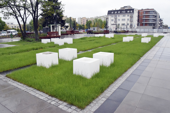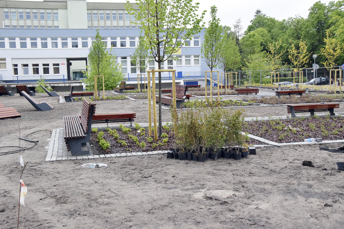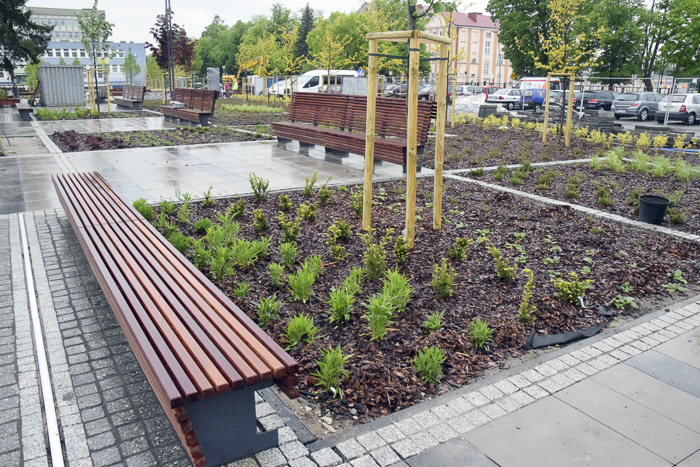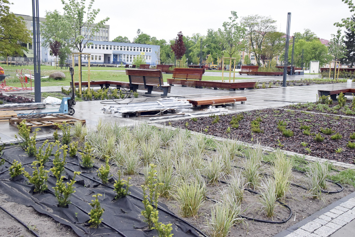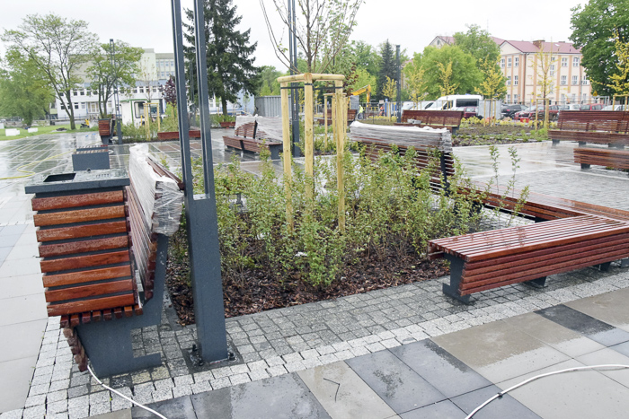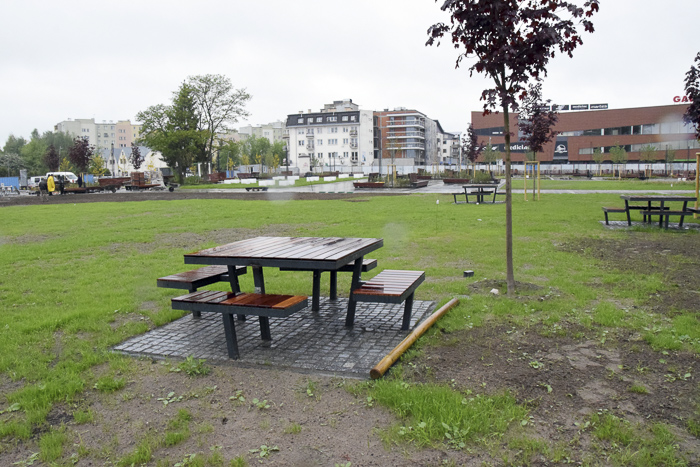 Najśmieszniejsze na tym placu są stoliki i "ławki" na środku trawnika, do których nie ma żadnych ścieżek. Trawa zasiana, urosła, jest zielono, ale szybko będą tam wydeptane ścieżki. A może postawia tabliczki "zakaz deptania trawnika"?