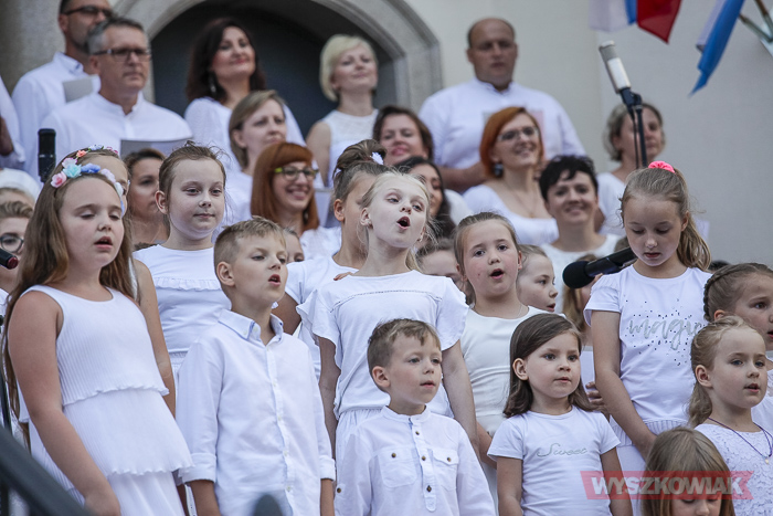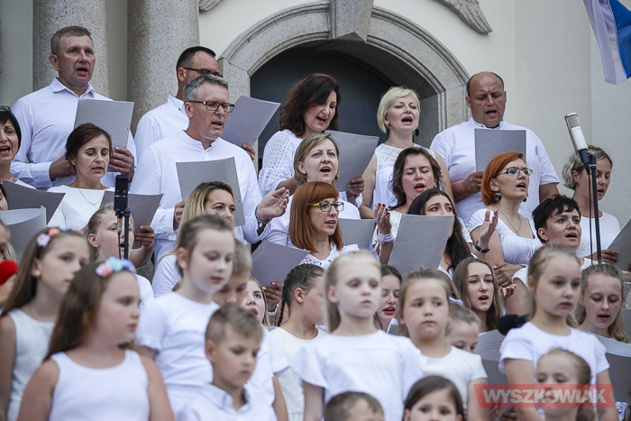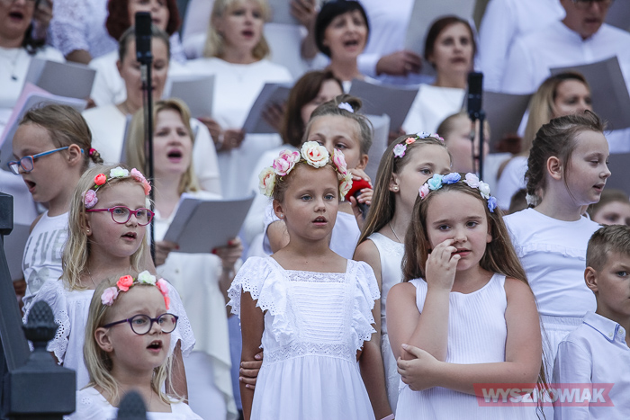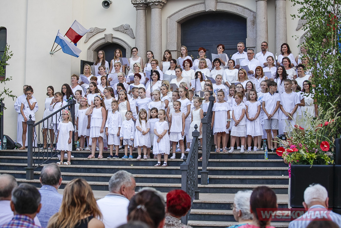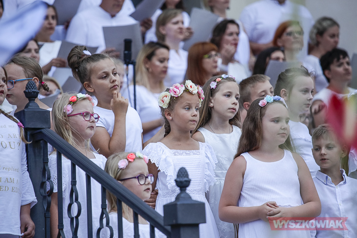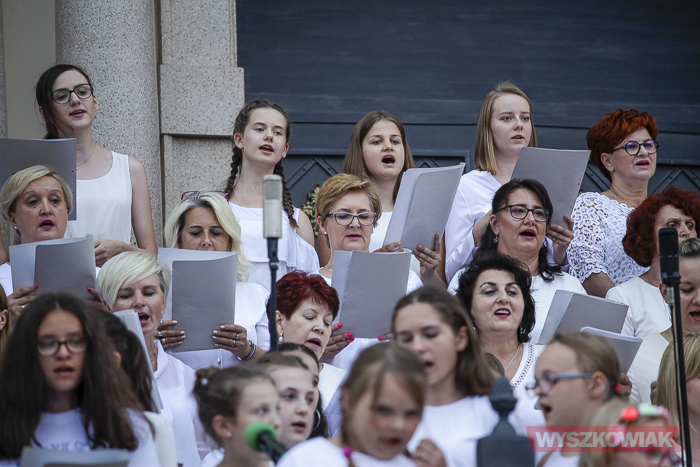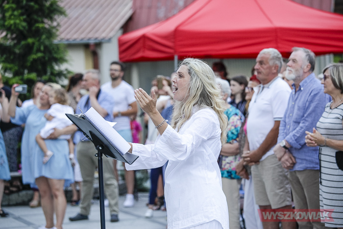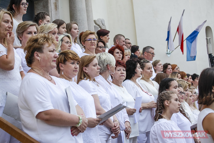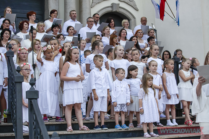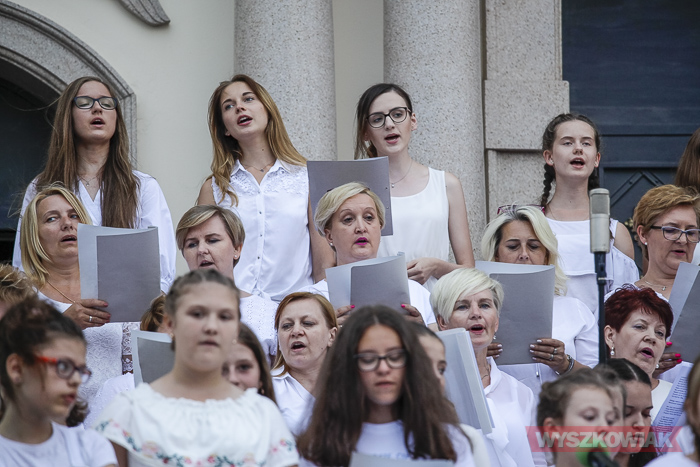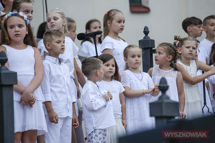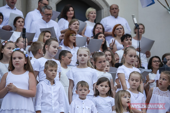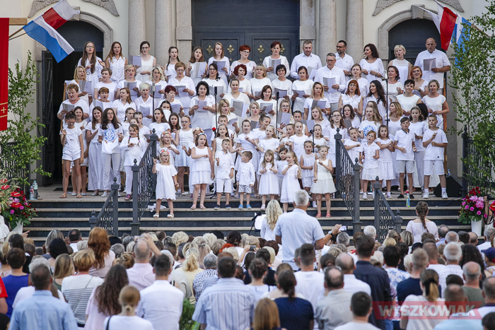Rzeczywiście, w czwartek wieczorem przed sanktuarium spotkały się osoby w różnym wieku, liczne grono wiernych chcące uczestniczyć w tym widowiskowym i radosnym koncercie. Chórem złożonym z dorosłych i dzieci kierowała Jana Dąbkowska. Wszyscy jak co roku ubrani na biało stanęli na schodach sanktuarium.