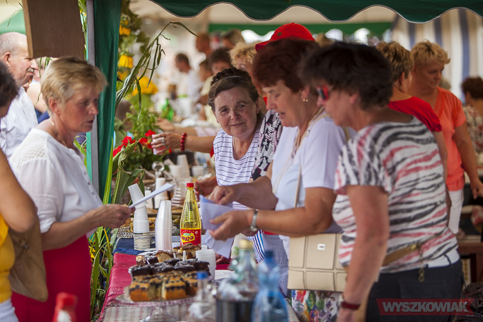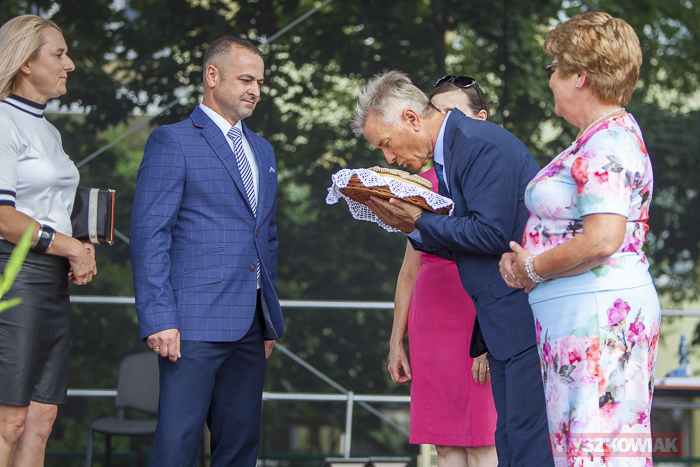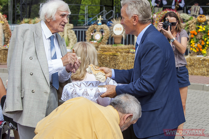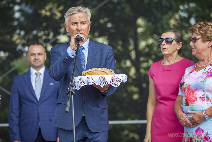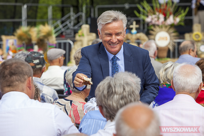 Następnie wójt podzieli się chlebem z zebranymi na placu targowym. Wśród nich byli radni, delegacje z wieńcami dożynkowymi, honorowi obywatele gminy, przedstawiciele sąsiednich samorządów, mieszkańcy i przyjezdni.