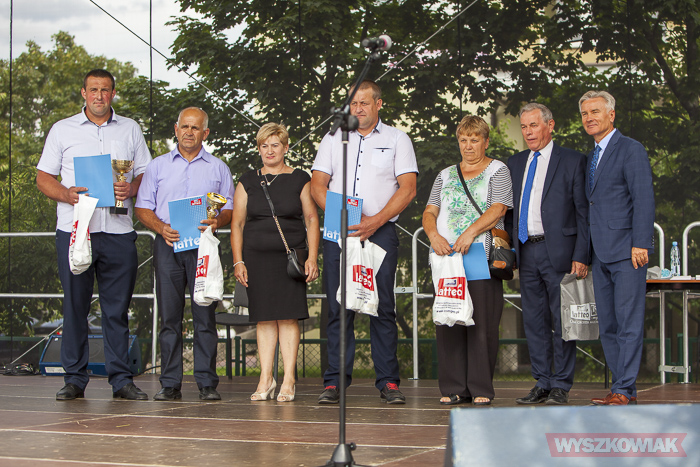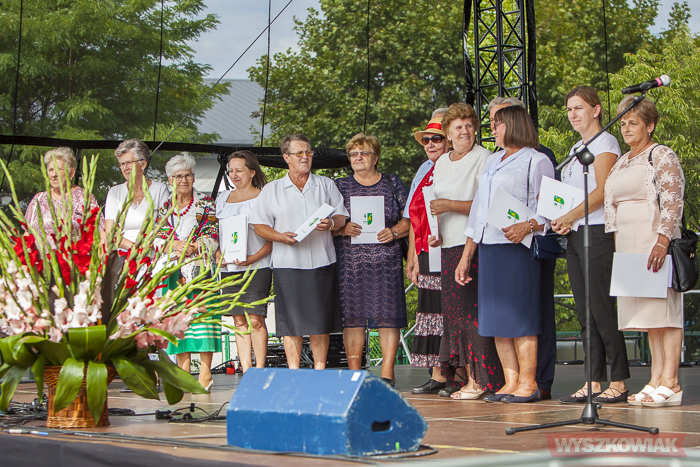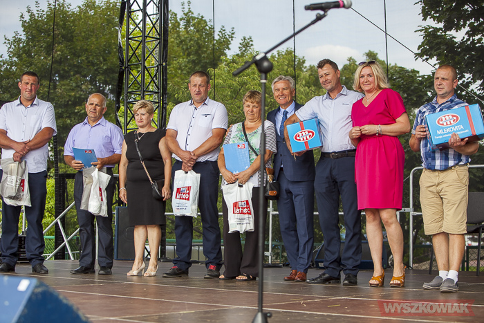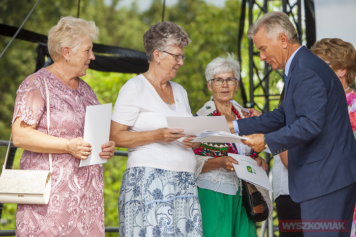 Przewodnicząca Rady Gminy Teresa Paradowska i Stanisław Jastrzębski wręczyli nagrody i dyplomy za wykonanie wieńców dożynkowych. Odebrali je przedstawiciele lokalnych klubów seniorów: Strażnicy Tradycji, Akademia Aktywnych Seniorów, Zosieńka, Złota Jesień, Niezapominajka, Bosewskie Starszaki, Jutrzenka, sołectw Kalinowo, Blochy, Znamiączki, Zalas, grupa samopomocowa Supermama.