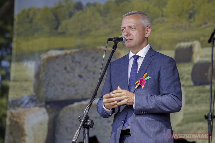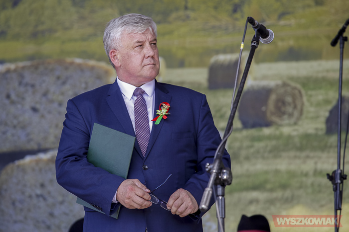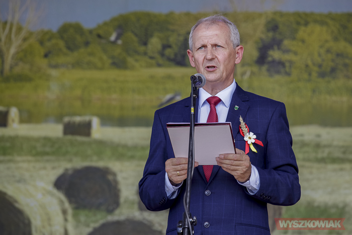 - Nie byłoby tego chleba, gdyby nie polska wieś i jej mieszkańcy, dla których codzienny trud to wyraz poszanowania tradycji, umiłowania rodzinnej ziemi, poczucie patriotyzmu - zabrał głos starosta Jerzy Żukowski. - Z wielką wdzięcznością oraz szacunkiem i podziwem dla cięzkiej pracy rolników spoglądamy na niezwykle wymowny chleb dożynkowy i przepiękne wieńce przyniesione przez delegacje gmin i sołectw. Świadczą one o tym, że tegoroczne żniwa, mimo licznych problemów i niesprzyjających warunków, przyniosły jednak upragniony plon. Jak nasi przodkowie pragniemy wspólnie cieszyć się, że żniwa dobiegły końca, a w naszych domach nie zabraknie codziennego chleba i innych plonów ziemi.