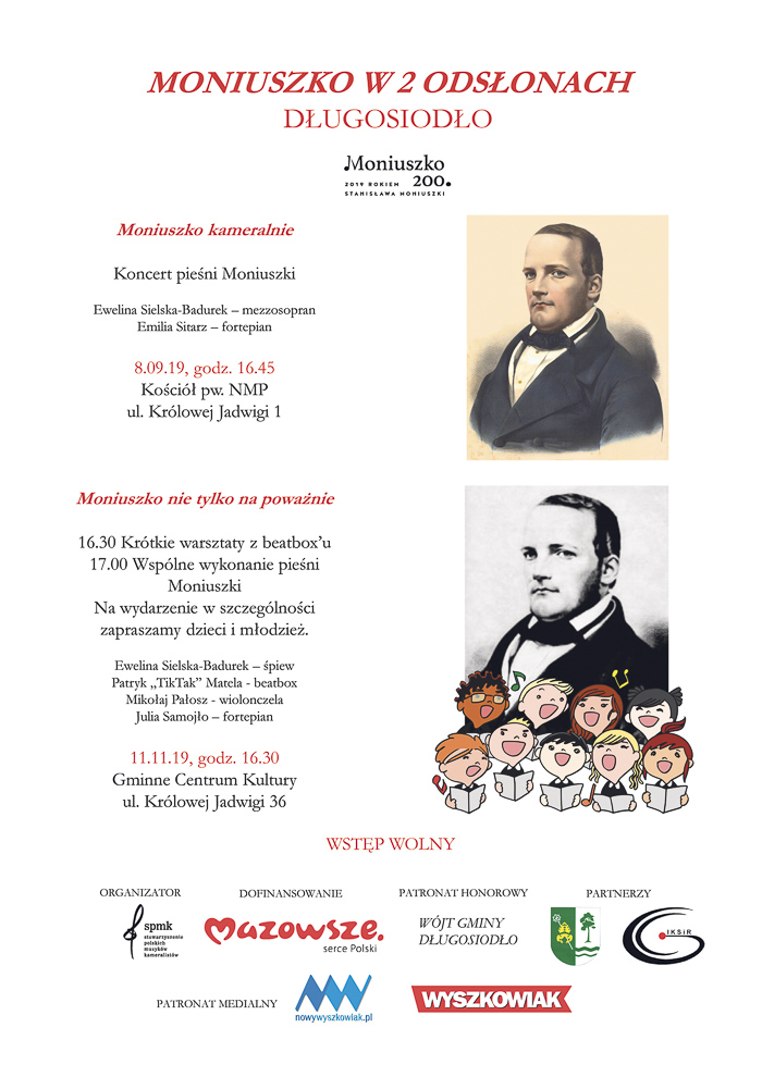 11 listopada w Gminnym Centrum Kultury o godz. 17.00 odbędzie się koncert „Moniuszko nie tylko na poważnie”, czyli wspólne wykonanie pieśni Moniuszki poprzedzone o godz. 16.30 warsztatami beatboxu. Wydarzenie skierowane w szczególności do dzieci i młodzieży.