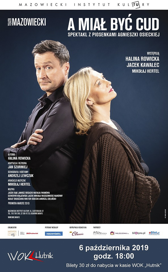 (Zam: 23.09.2019 r., godz. 10.42)Co się stało z naszą miłością? Mogą siebie zapytać Anna i Franciszek - bohaterowie nowej sztuki Teatru Mazowieckiego – spektaklu poetycko muzycznego „A miał być cud”, którego scenariusz powstał na kanwie tekstów Agnieszki Osieckiej. A ona jak nikt inny umiała pisać o miłości - nie tylko tej wielkiej, pierwszej, ale i tej dojrzałej, znudzonej rutyną dnia codziennego, tęskniącej za szaleństwem i porywami wielkich namiętności. Osiecką można nazwać mistrzynią w wynajdywaniu poezji w prozie życia, w inteligentnym łączeniu tego, co wzniosłe i poważne z tym co niskie i zwyczajne. Może jednak, koniec końców, to właśnie ta codzienność jest czymś najważniejszym? Kiedy po latach bycia razem wydaje nam się, że życie z kimś innym byłoby lepsze i wspanialsze, nagle okazuje się, że chcemy być z tą lub z tym właśnie - w znanej, czasami nieciekawej, ale bliskiej zwyczajności. Tak właśnie jak Anna i Franciszek - już niemłodzi, znający na wylot swoje słabostki, często irytujący siebie nawzajem, drażliwi, ale mimo wszystko ze sobą, obok siebie. Czasami tylko tęsknota nas gna, coś w sercu gra, kiedy chce się lecieć, uciec i szaleć, kiedy chce się powiedzieć słowami piosenki Osieckiej „uciekaj moje serce”.