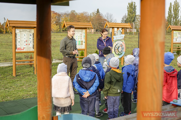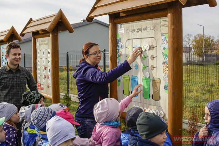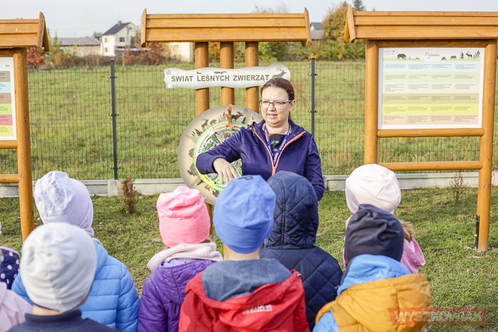 Dzieci rozpoczęły lekcję od odwiedzenia ścieżki, na którą składa się szereg tablic. Najmłodsi mogą przy ich pomocy odpowiadać na pytania i zdobywać wiedzę na temat roślin, występujący w okolicznych lasach zwierząt, zasad segregacji śmieci itp.