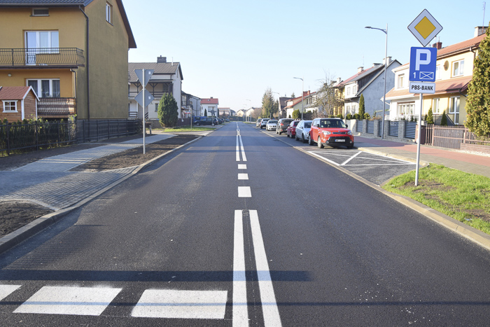 Było to jedno z najważniejszych zadań inwestycyjnych gminy tego roku. Całkowicie wymieniona została zdegradowana nawierzchnia jezdni, powstały nowe ciągi piesze i rowerowe, oznakowanie poziome i pionowe, parkingi oraz sieć kanalizacji deszczowej. Stara linia oświetlenia ulicznego została zastąpiona nową z oprawami w technologii LED. Według samorządu, dołożono wszelkich starań, aby inwestycja jak najmniej ingerowała w istniejący drzewostan. Z przewidzianych w projekcie do wycinki 88 drzew udało się pozostawić 66. W trakcie realizacji zadania na bieżąco zakładano trawniki. Jedno z nowych przejść dla pieszych w okolicy szkoły zostało wyposażone w znaki aktywne.