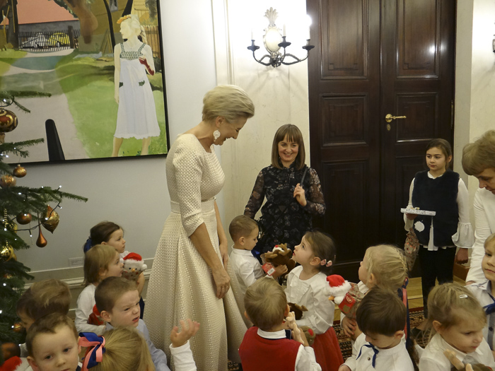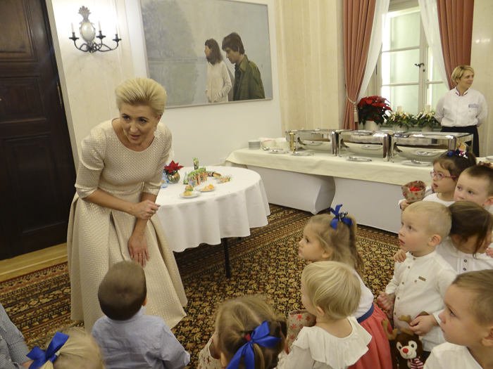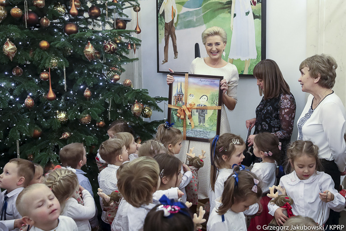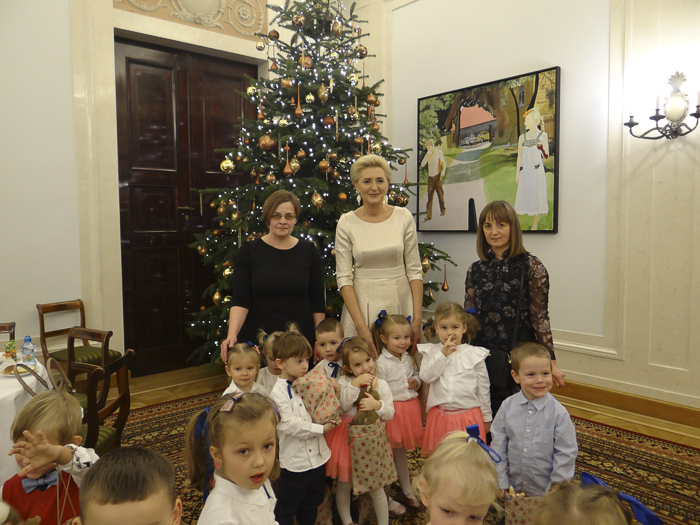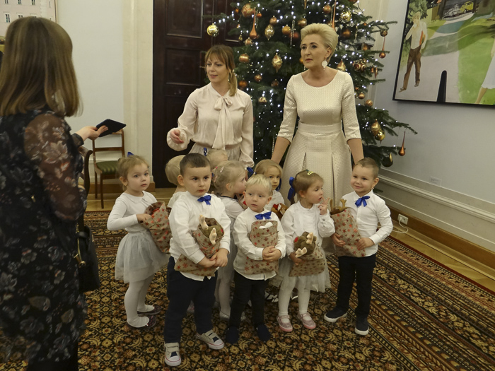 (Zam: 19.12.2019 r., godz. 09.39)Na zaproszenie Pierwszej Damy Agaty Kornhauser-Dudy przedszkolaki odwiedziły Pałac Prezydencki. Na początku Agata Kornhauser-Duda powitała dzieci przybyłe do siedziby głowy państwa, a następnie złożyła życzenia dzieciom i ich rodzicom z okazji zbliżających się Świąt Bożego Narodzenia oraz zaprosiła na spotkanie ze Świętym Mikołajem. Dzieci obejrzały spektakl muzyczno-teatralny „Imieniny Św. Mikołaja” przygotowany przez aktorów Teatru Kamienica. Maluchy dowiedziały się skąd pochodzi św. Mikołaj, jak wygląda lapońskie kino i pakowalnia prezentów. Poznały też Śnieżynkę oraz obejrzały mikołajowy pokaz mody. W podziękowaniu za prezenty, które Mikołaj roznosił przez całą noc wszystkim ich rówieśnikom na świecie, przygotowały wspólnie ze Śnieżynką imieninową piosenkę niespodziankę. Święty Mikołaj zaś obdarował wszystkie zaproszone dzieci prezentami.