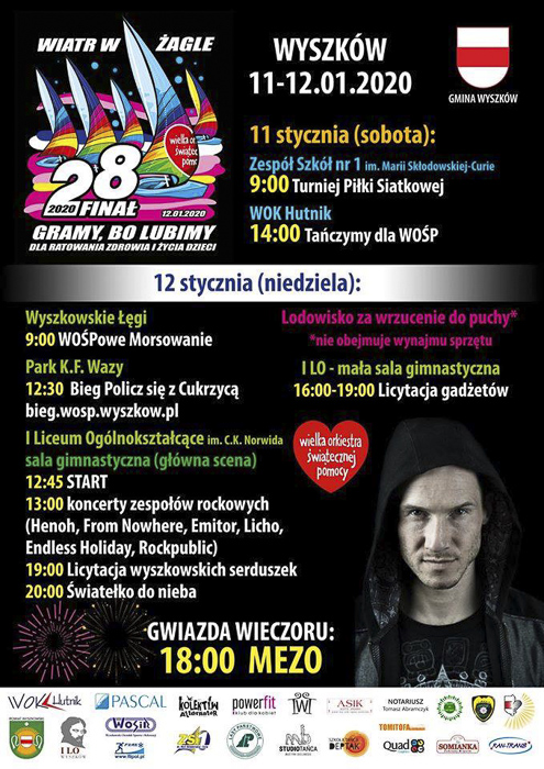 (Zam: 02.01.2020 r., godz. 12.39)Początek koncertu gwiazdy w hali sportowej I Liceum Ogólnokształcącego im. C.K. Norwida o godz. 18.00. Mezo jest zdobywcą wielu prestiżowych nagród, brał udział w „Bitwie na głosy”. Współpracował m.in. z Kasią Wilk, Mieczysławem Szcześniakiem, Liberem. Współtworzył takie utwory jak „Aniele”, „Sacrum”, „Ważne”. Między innymi dzięki tym utworom Mezo jest jednym z najpopularniejszych polskich artystów młodego pokolenia. Ważną częścią jego życia jest także sport.