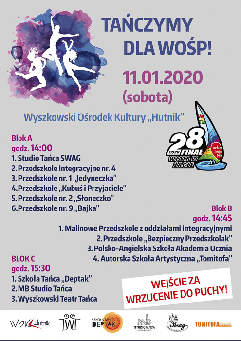(Zam: 10.01.2020 r., godz. 09.02)Sztab WOŚP zaprasza do uczestnictwa w przygotowanych wydarzeniach, a przede wszystkim finansowego wspierania zbiórki, która w tym roku realizowana jest z myślą o zakupie najnowocześniejszych urządzeń do ratowania życia i zdrowia dzieci potrzebujących różnego rodzaju operacji.