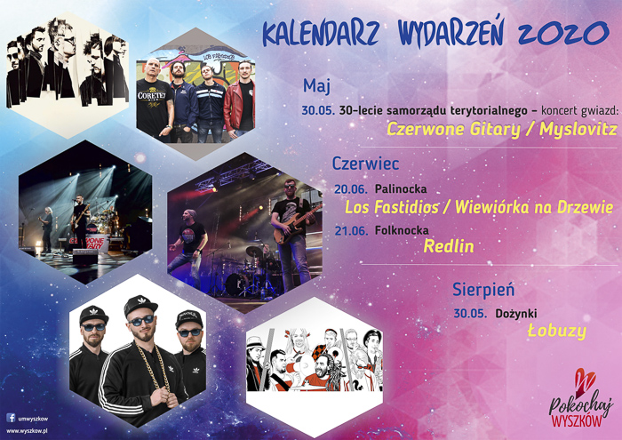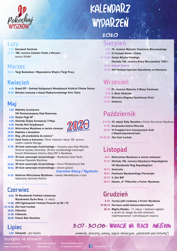 W 2020 r. nie zabraknie imprez znanych już mieszkańcom, jak: rowerowa majówka turystyczna, parada moli książkowych, festiwal latawcowy (przełożony w tym roku na pierwszą sobotę czerwca), Rally Wyszków, zlot WiP, czy zloty food trucków.
