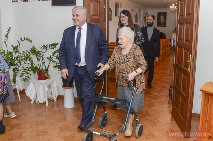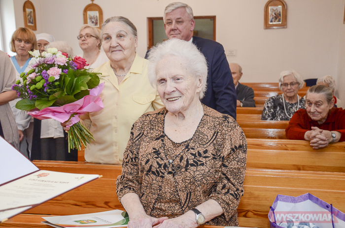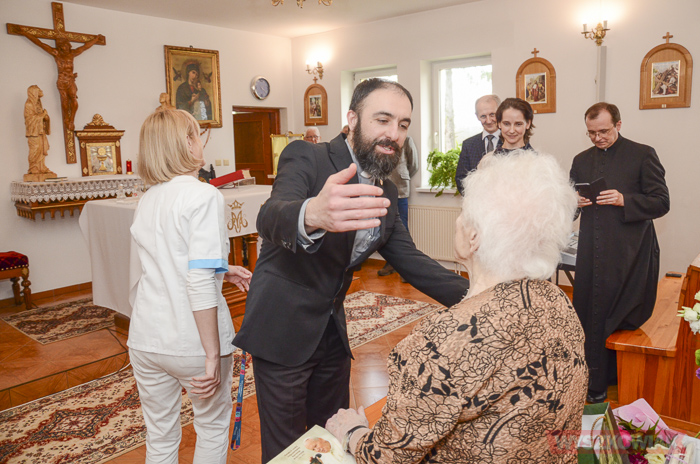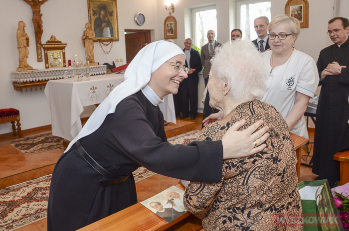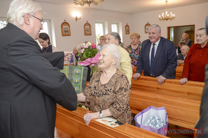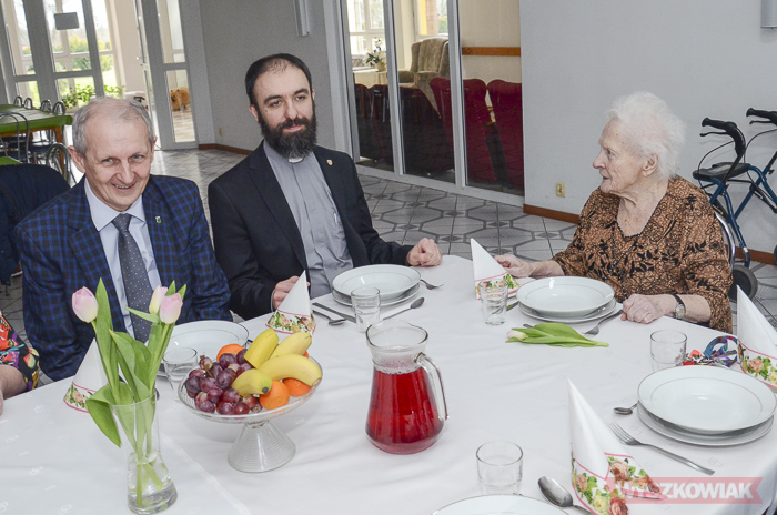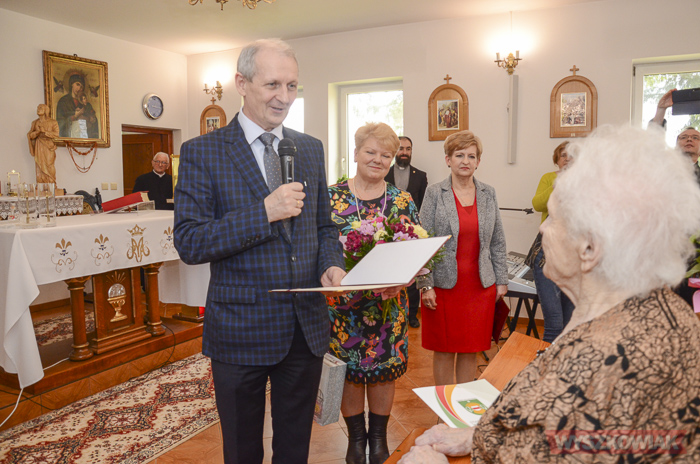 Wśród gratulujących była radna Jadwiga Stoszewska, kierownik Urzędu Stanu Cywilnego Teresa Kasprowicz, ks. Proboszcz Paweł Stachecki, dyrektor domu ks. Łukasz Mikołajczyk. Również mieszkańcy pracownicy domu obsypali jubilatkę kwiatami.