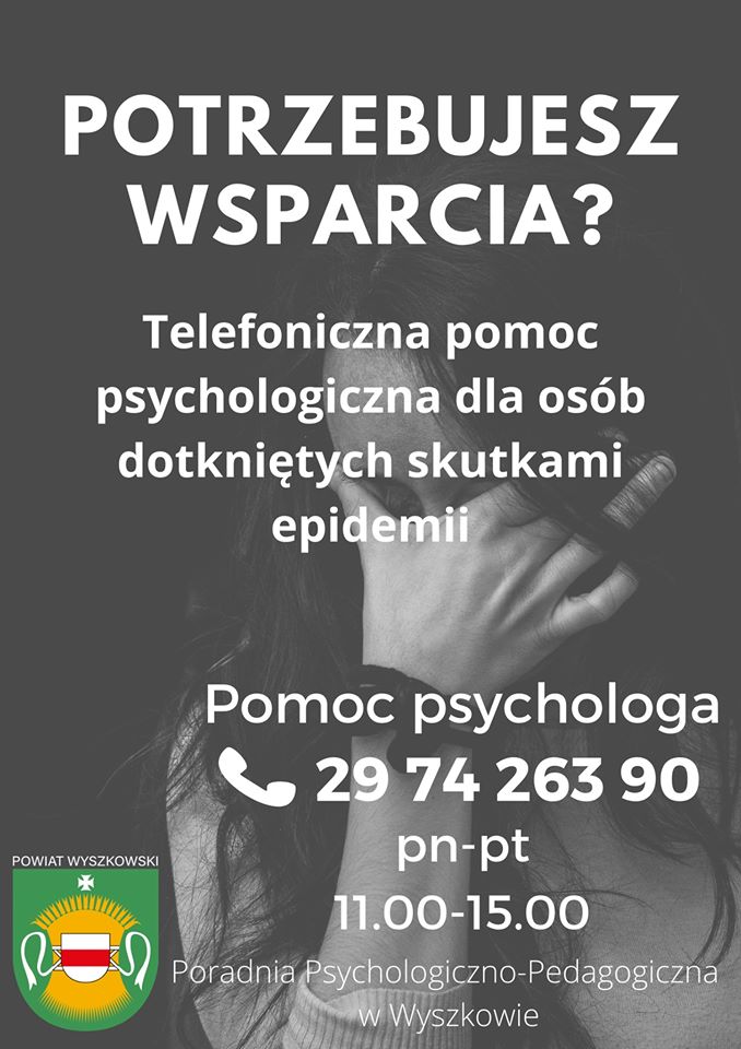 (Zam: 02.04.2020 r., godz. 13.53)Poradnia zaprasza do kontaktu telefonicznego z psychologiem codziennie od poniedziałku do piątku w godzinach 11.00-15.00 pod numerem tel. 29 74 263 90.