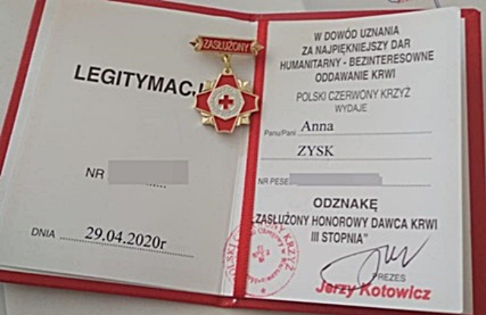 (Zam: 16.05.2020 r., godz. 07.27)Policjantka z wydziału kryminalnego asp. Anna Zysk i sierż. szt. Ariel Pietruszka z Posterunku Policji w Zabrodziu otrzymali odznaczenia za oddanie ponad 6 litrów krwi (funkcjonariusze razem na swoim koncie mają oddanych ponad 14 litrów). Swoją postawą zachęcają innych do oddawania krwi, pomagania w ten sposób chorym i ratowania życia.