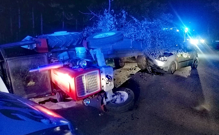 (Zam: 13.08.2020 r., godz. 12.09)Ze wstępnych ustaleń policjantów ruchu drogowego wynika, że kierujący osobówką nieostrożnie próbował ominąć strojący pojazd - widząc z przeciwnej strony samochód, gwałtownie odbił kierownicą i wrócił na wcześniej zajmowany pas ruchu, na którym był ciągnik rolniczy z przyczepą. Osobówka uderzyła w przyczepę. Maszyna rolnicza, w której był 27-latek, wywróciła się.