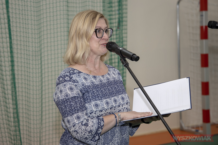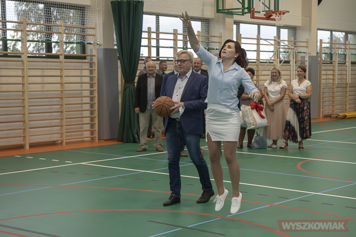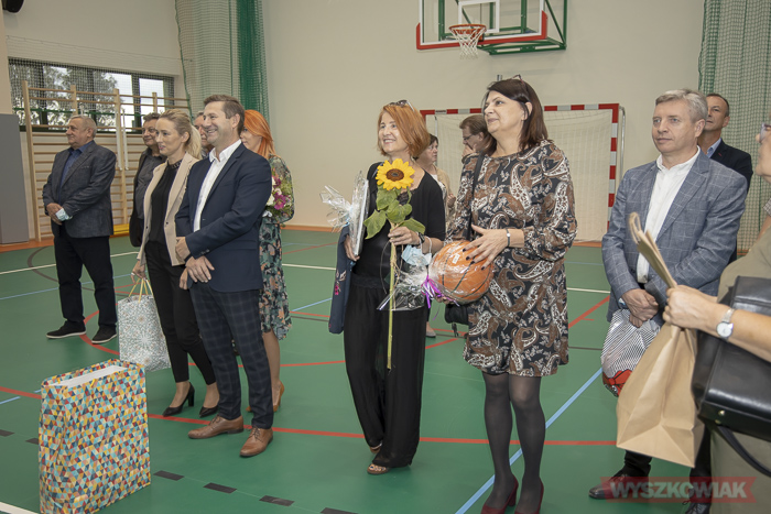 Tylko Monika w obuwiu sportowym, żeby nie zniszczyć parkietu. Nie widzę byłej dyrektor szkoły, który pewnie swój udział miała w budowie. Czy tak szybko zapomniano o niej.