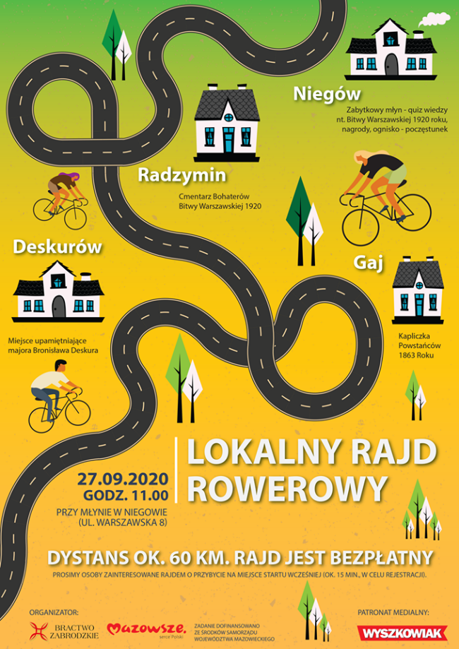 (Zam: 25.09.2020 r., godz. 08.50)Do przejechania będzie ok. 60 km. Start o godz. 11.00 sprzed młyna w Niegowie. Na trasie: Gaj (kapliczka powstańców 1863 r.), Deskurów (miejsce upamiętniające majora Bronisława Deskura), Radzymin (cmentarz Bohaterów Bitwy Warszawskiej 1920).