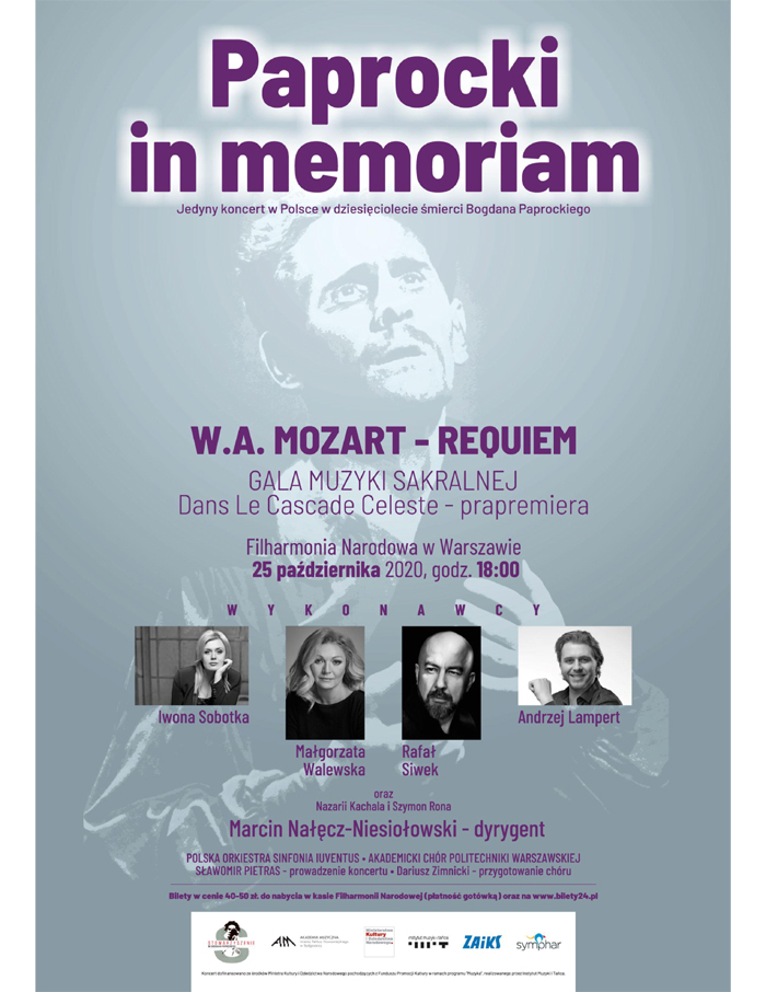 (Zam: 25.09.2020 r., godz. 09.27)Koncert z cyklu „Paprocki in memoriam” w Filharmonii Narodowej w Warszawie odbędzie się 25 października (niedziela). W programie: gala muzyki sakralnej, „Requiem” Wolfganga Amadeusza Mozarta, prawykonanie utworu „Dans la Cascade Seleste” autorstwa młodego kompozytora, Juliana Paprockiego. Utwory w wykonaniu: Iwony Sobotki - sopranu, Andrzeja Lamperta - tenora, Małgorzaty Walewskiej – mezzosopranu i Rafała Siwka – basa, laureatów Konkursu Wokalnego im. Bogdana Paprockiego. Solistom towarzyszyć będzie Polska Orkiestra Sinfonia Iuventus pod batutą Marcina Nałęcza-Niesiołowskiego oraz Chór Politechniki Warszawskiej.