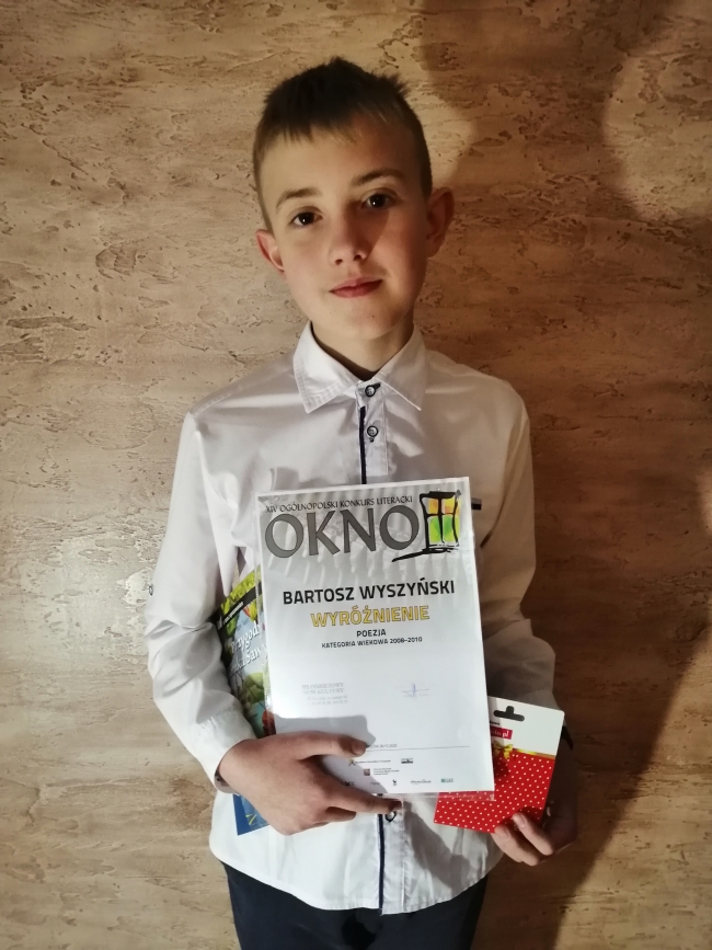 (Zam: 23.11.2020 r., godz. 10.42)Uczestnicy mieli za zadanie stworzyć zestaw trzech wierszy i/lub utwór prozatorski o dowolnej tematyce. Prace należało przygotować w trzech egzemplarzach i opatrzyć godłem autora, tak jak w profesjonalnych konkursach literackich. Wyniki zostały ogłoszone dopiero pod koniec października. Jury, składające się ze znanych literatów i zdobywców prestiżowych nagród, doceniło twórczość liryczną Bartosza Wyszyńskiego i przyznało mu wyróżnienie, co jest znaczącym osiągnięciem, zważywszy na fakt, że nie było I miejsca. Nie jest to pierwszy sukces siódmoklasisty w Ogólnopolskich Konkursach Literackich - za każdym razem jednak cieszy tak samo. Społeczność szkoły gratuluje Bartkowi sukcesu i życzy jeszcze wielu nagród.