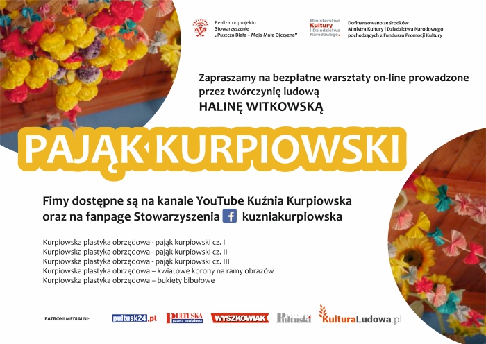 Cykl warsztatów online zrealizowany został w ramach projektu pn. „Pająk kurpiowski” dofinansowanego ze środków Ministra Kultury i Dziedzictwa Narodowego pochodzących z Funduszu Promocji Kultury. Na warsztaty składa się 5 filmów instruktażowych prezentowanych na kanale YouTube oraz fanpage kuzniakurpiowska w okresie od 23 listopada 2020 r. Trzy pierwsze filmy warsztatowe poświęcone zostały powstawaniu pająka kurpiowskiego promienistego. Czwarty film prezentuje sposób wykonania koron kwiatowych, które przyozdabiały ramy obrazów świętych znajdujących się w domach Kurpiów. Piąty film prezentuje wykonanie bukietów kwiatowych – kwiaty bibułowe – umieszczanych przeważnie w „świętym kącie”. Mamy nadzieję, że filmy warsztatowe zainteresują nie tylko miłośników sztuki ludowej, ale również osoby poszukujące inspiracji w swoich działaniach artystycznych. Odbiorcy otrzymają szczegółowe instrukcje dotyczące wykonania wyrobów tradycyjnych i mamy nadzieję, że będą czerpać z nich wiedzę praktyczną tworząc własne niepowtarzalne wyroby.
