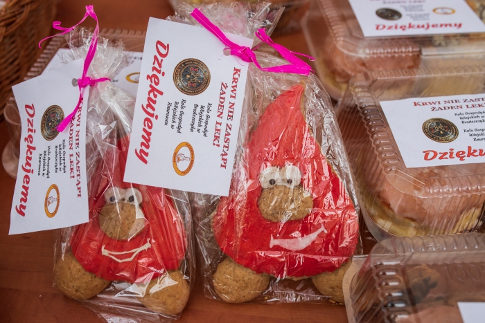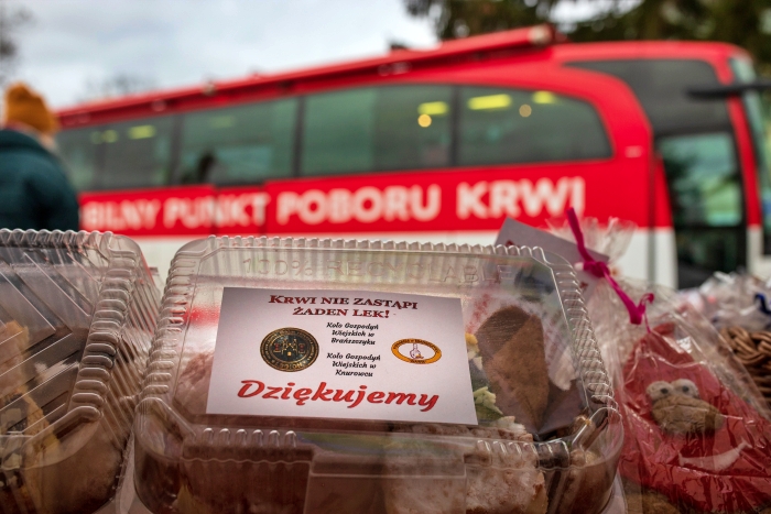 Sobotnia akcja upłynęła w miłej, przyjaznej i serdecznej atmosferze. A to zasługa szeregu organizacji, samorządu lokalnego, powiatu wyszkowskiego i lokalnych firm, które zechciały włączyć się w promocję tego wydarzenia i postanowili aktywnie włączyć się w akcję. Krwiodawcy oddawali krew w ambulansie, a po donacji i po opuszczeniu ambulansu czekały na nich upominki i gadżety przygotowane przez partnerów. Było tego naprawdę bardzo dużo: kalendarze, kolorowanki, odblaski, albumy, kubeczki, publikacje lokalne, pyszne pączki, ciasto i nowość! - kropelki pierniczki różnej wielkości, ale też z różnym oznaczeniem grupy krwi. Była też woda oraz jabłka, a na długie jesienne wieczory można było zabrać ze sobą do domu książki o różnej tematyce. Były również kupony rabatowe do zakładu fryzjerskiego. O miłą obsługę i gościnność oraz o to, aby każdy krwiodawca został godnie zaopatrzony w gadżety dbali Marta Gołębiewska (dyrektor Gminnej Biblioteki Publicznej w Brańszczyku), Małgorzata Wójcik, Dominika Wójcik i Mariola Najmoła (Koło Gospodyń Wiejskich w Knurowcu), Renata Kulesza (GBP w Brańszczyku / Koło Gospodyń Wiejskich w Brańszczyku), Paweł Bralewski (Koordynator Porębskiej Kropelki – oddziału Klubu HDK Legion) i Katarzyna Bralewska (Gminne Centrum Kultury, Sportu i Turystyki w Brańszczyku)