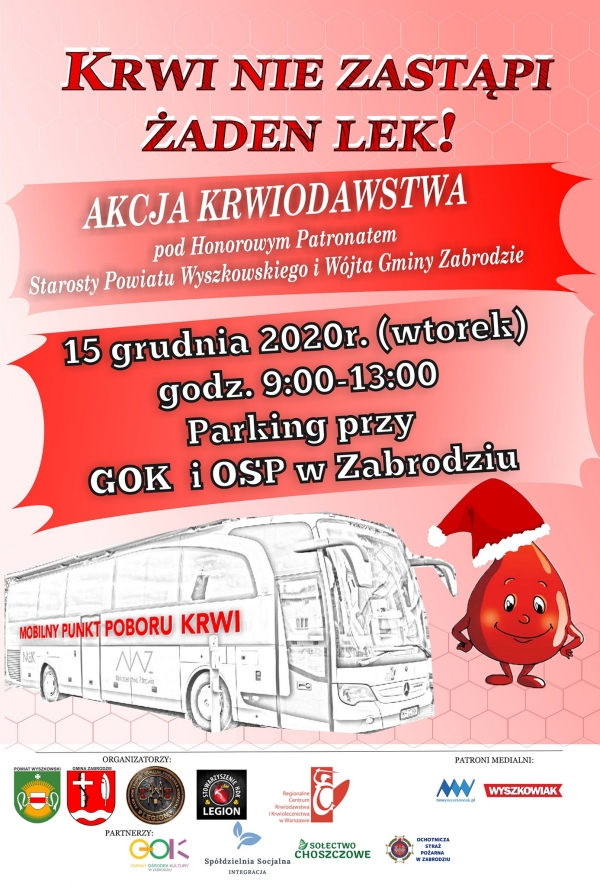 (Zam: 09.12.2020 r., godz. 08.35)Oddział Klubu Honorowych Dawców Krwi Legion - Porębska Kropelka zaprasza na kolejną akcję krwiodawstwa. Ambulans Regionalnego Centrum Krwiodawstwa i Krwiolecznictwa (RCKiK) dostępny będzie 15 grudnia w godz. 9.00-13.00 na parkingu przy Gminnym Ośrodkiem Kultury w Zabrodziu. To ostatnia takie przedsięwzięcie Porębskiej Kropelki w tym roku. W organizacji wspiera ją szereg organizacji i podmiotów. Dla krwiodawców upominki od św. Mikołaja.