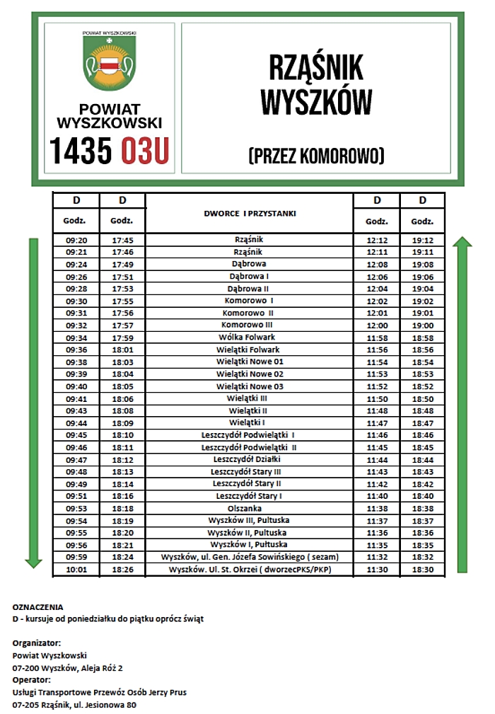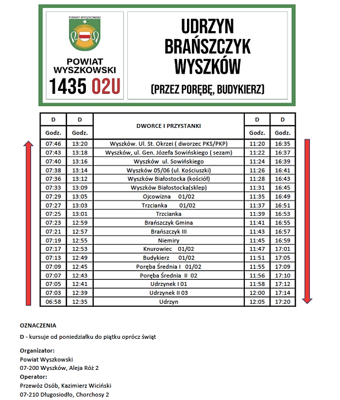Autobusy będą kursować od poniedziałku do piątku (oprócz świąt), również w wakacje oraz inne dni wolne od nauki szkolnej, jak ferie zimowe czy świąteczne. Dzięki temu korzystać z nich będą mogli wszyscy mieszkańcy, nie tylko młodzież dojeżdżająca do wyszkowskich szkół średnich.